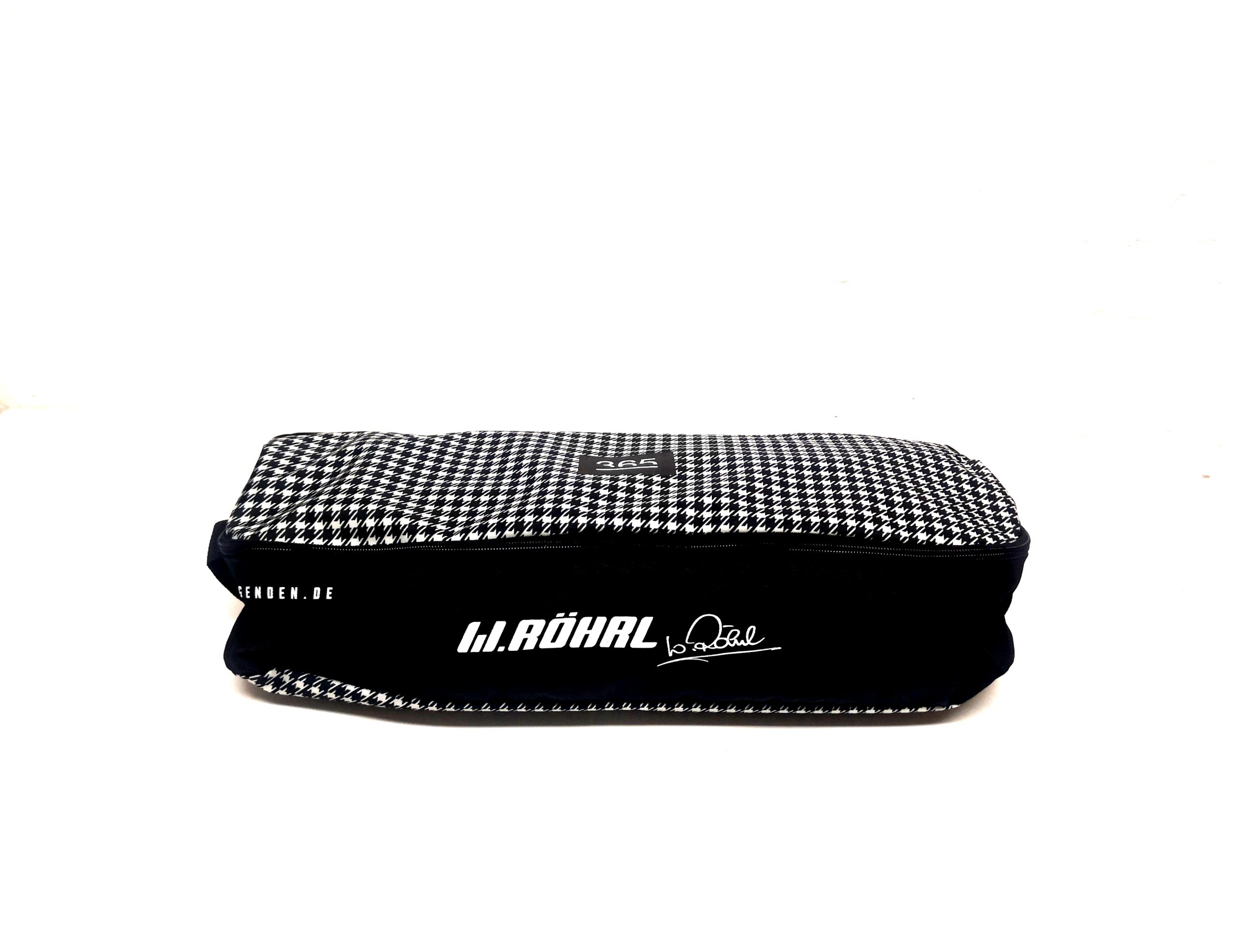 Campingstuhl in Rennschalenoptik mit klassischen Pepita-Design. Mit der stylischen Tragetasche, kann der Campingstuhl sehr kompakt in jedem Fahrzeug schnell verstaut werden. Die Füße sind in der Höhe verstellbar. Maximale Belastbarkeit laut Hersteller: 110kg.